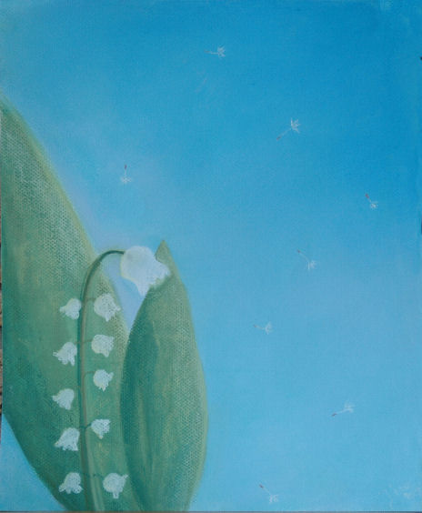 Daisy van Emst - 18 juli 1992Je ziet een lelietje op een achtergrond van blauwe lucht, waarin enkele pluisjes zweven.